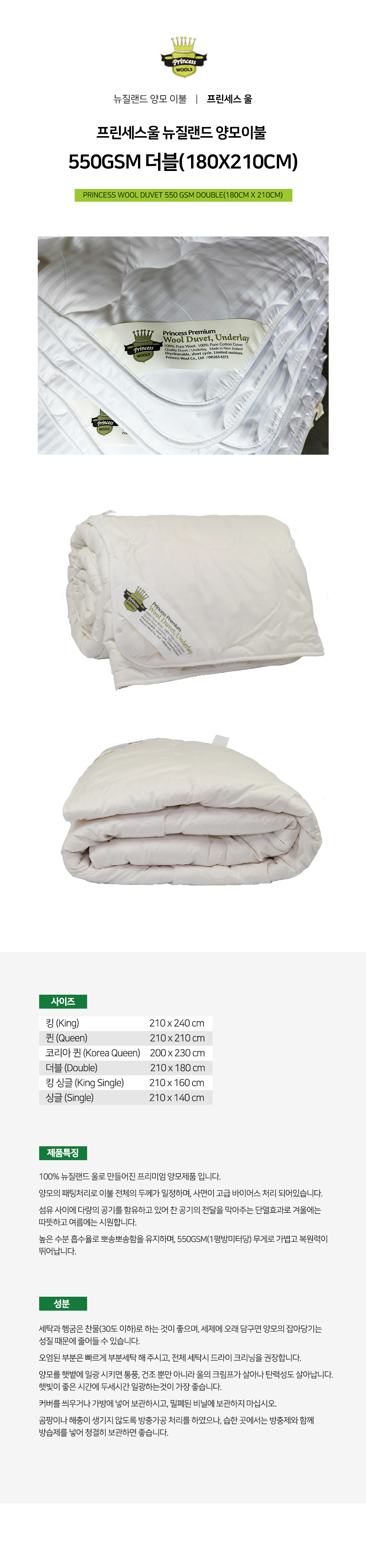 프린세스울 뉴질랜드 양모 이불 550gsm 더블(180x210cm)ON SALE