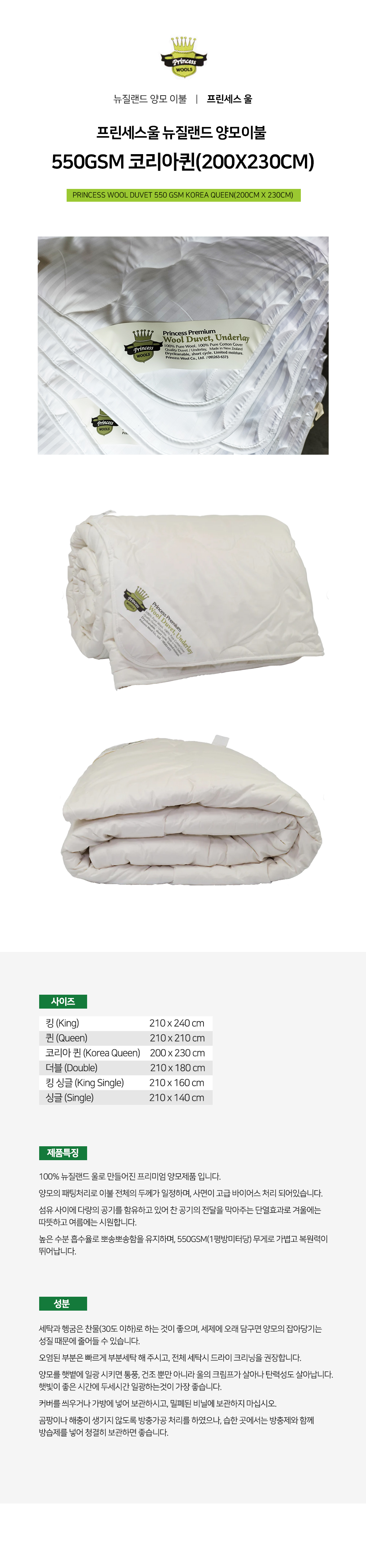 프린세스울 뉴질랜드 양모 이불 550gsm 코리아퀸(200x230cm)