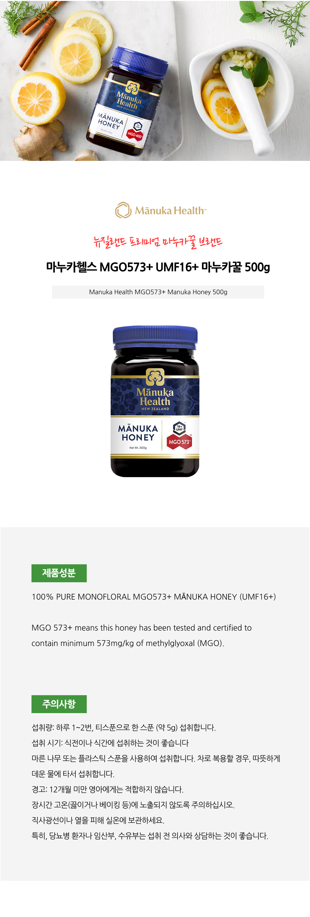 [명절특가] 마누카헬스 MGO573+(UMF16+) 뉴질랜드 마누카꿀 500gON SALE